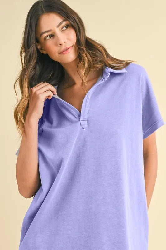 The Mineral Washed Johnny Collar Short Sleeve Dress is a chic and laid-back piece perfect for a casual day out. The mineral wash gives the dress a unique and vintage look with subtle variations in color. The Johnny collar adds a stylish touch with its V-shaped neckline and button accents. The short sleeves make it ideal for warmer weather, while the relaxed fit ensures all-day comfort. This dress is versatile and can be dressed up with accessories or worn casually with sneakers for a trendy and effortless outfit.