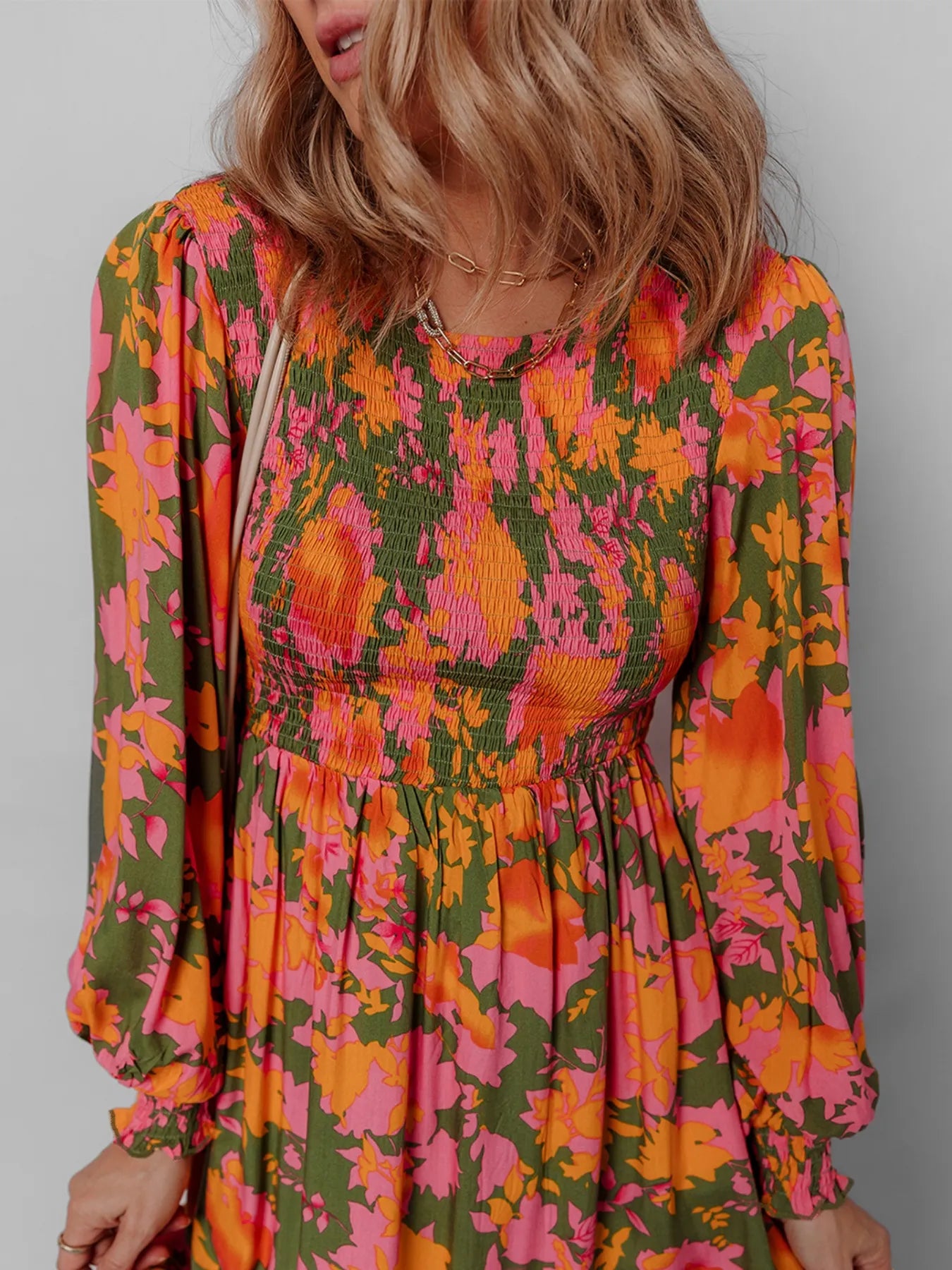 Smocked Floral Print Long Sleeve Maxi Dress