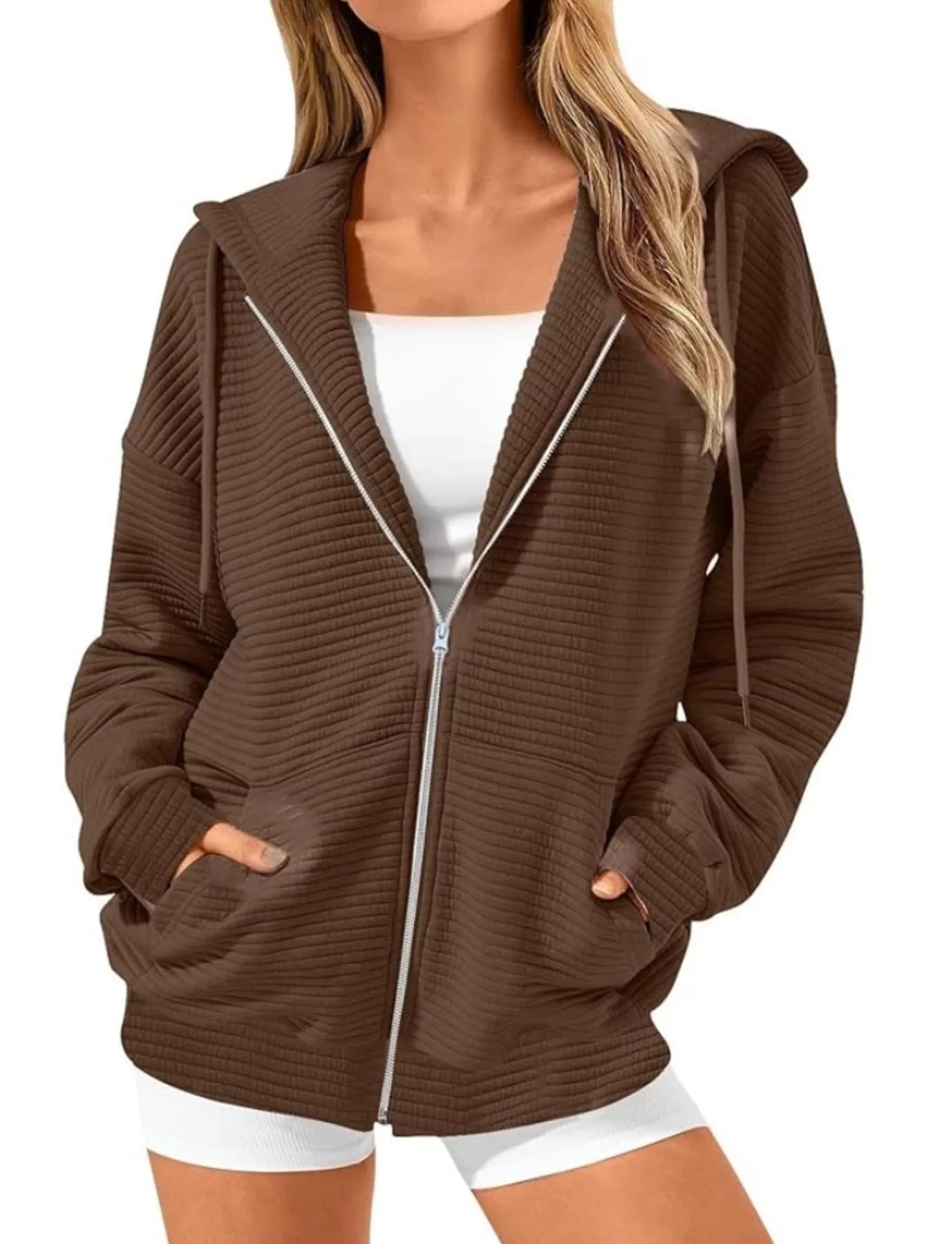 Velste Drawstring Zip Up Dropped Shoulder Hoodie