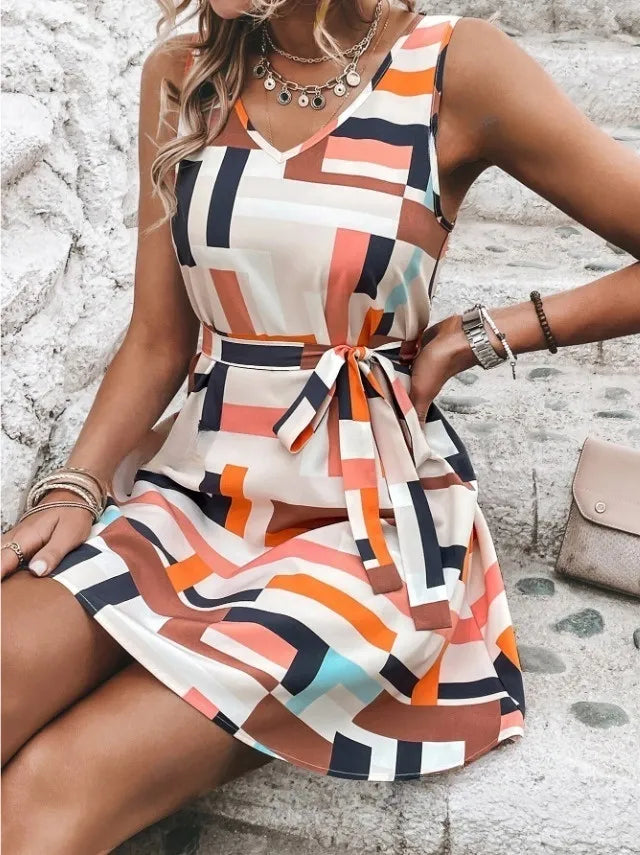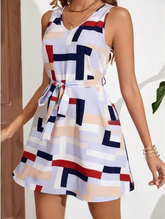 Velste Geometric Print Sleeveless Mini Dress with Belt