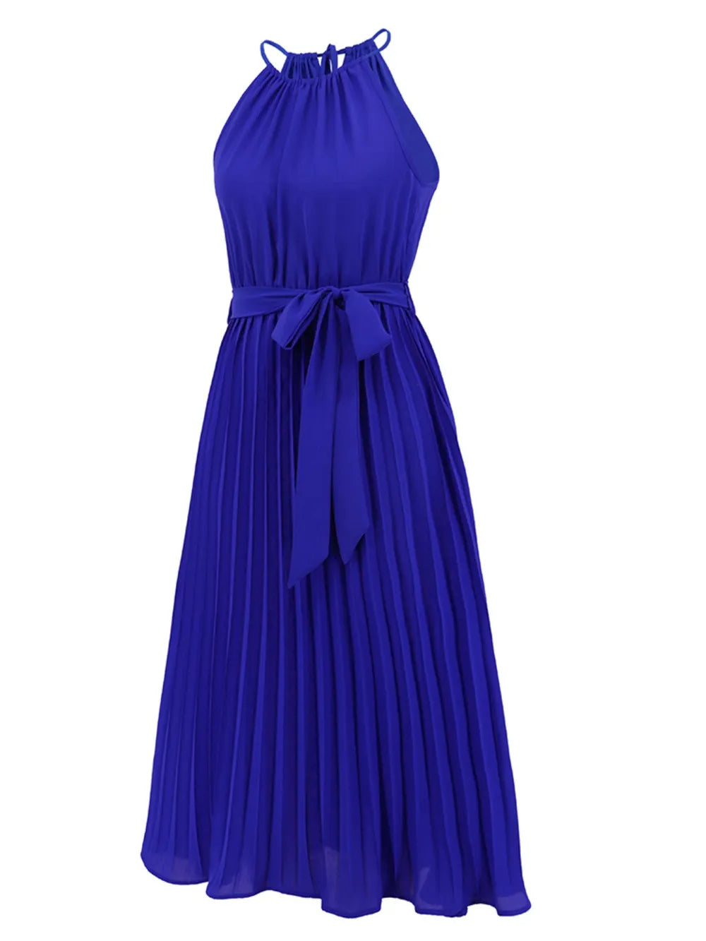 Velste Pleated Spaghetti Strap Tie Waist Midi Dress