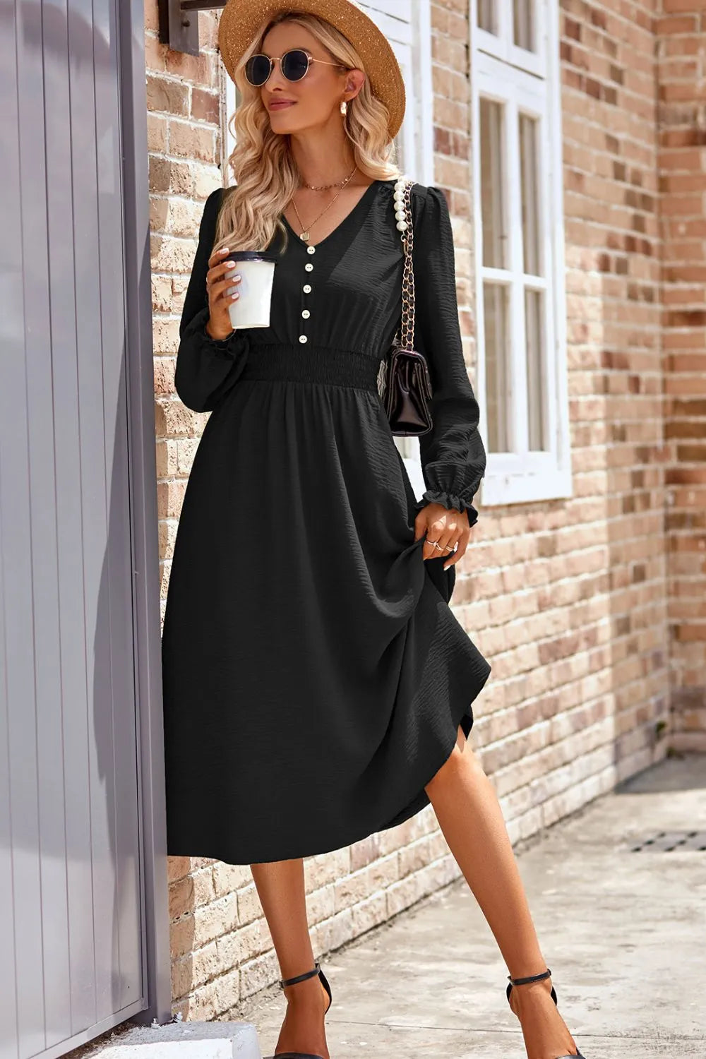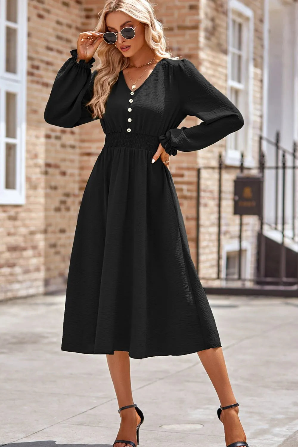 - Features: Decorative Button, Smocked