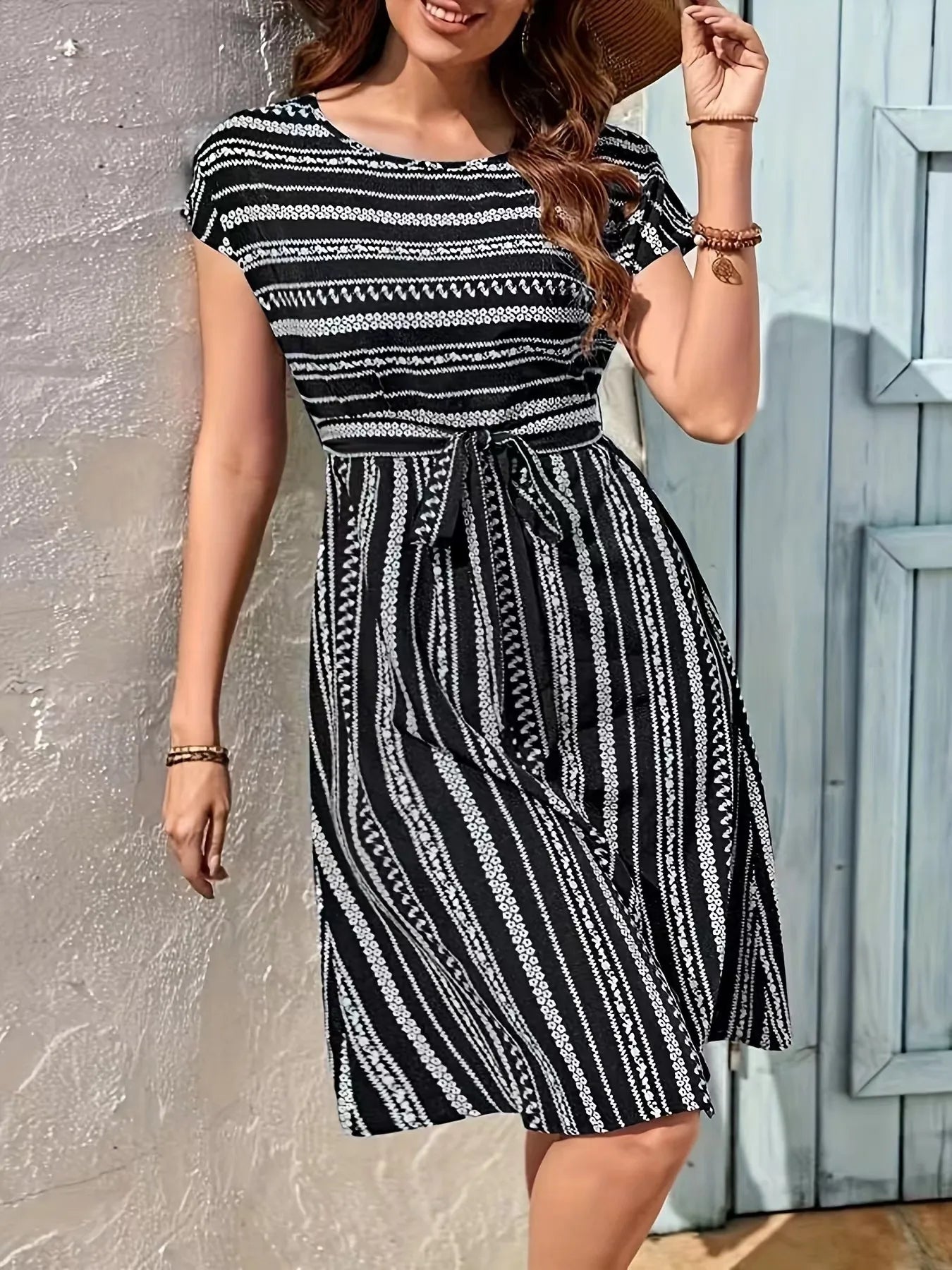 Striped Round Neck Short Sleeve Casual Dress