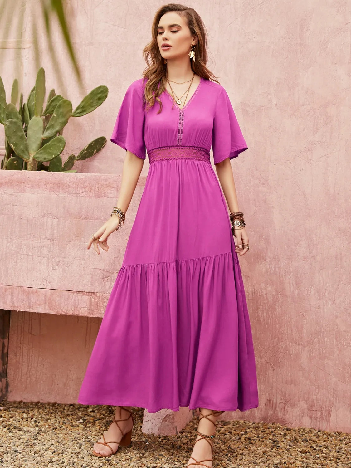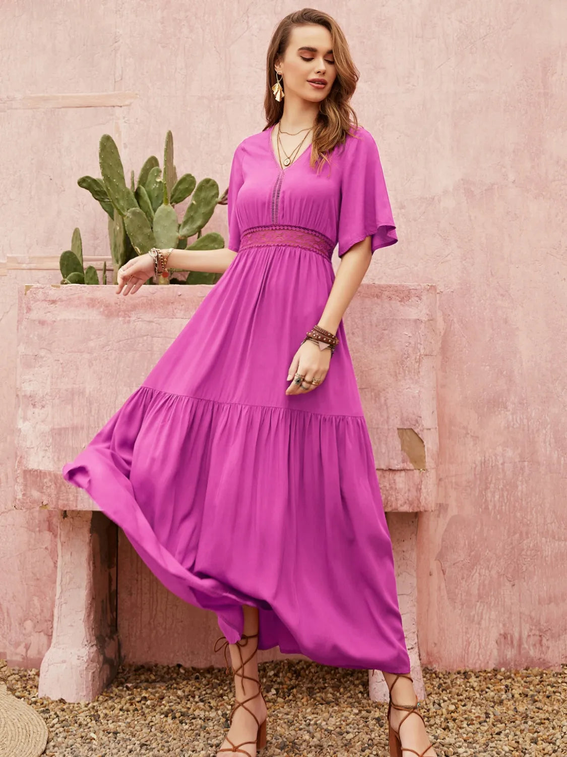 Lace Detail V-Neck Short Sleeve Midi Dress