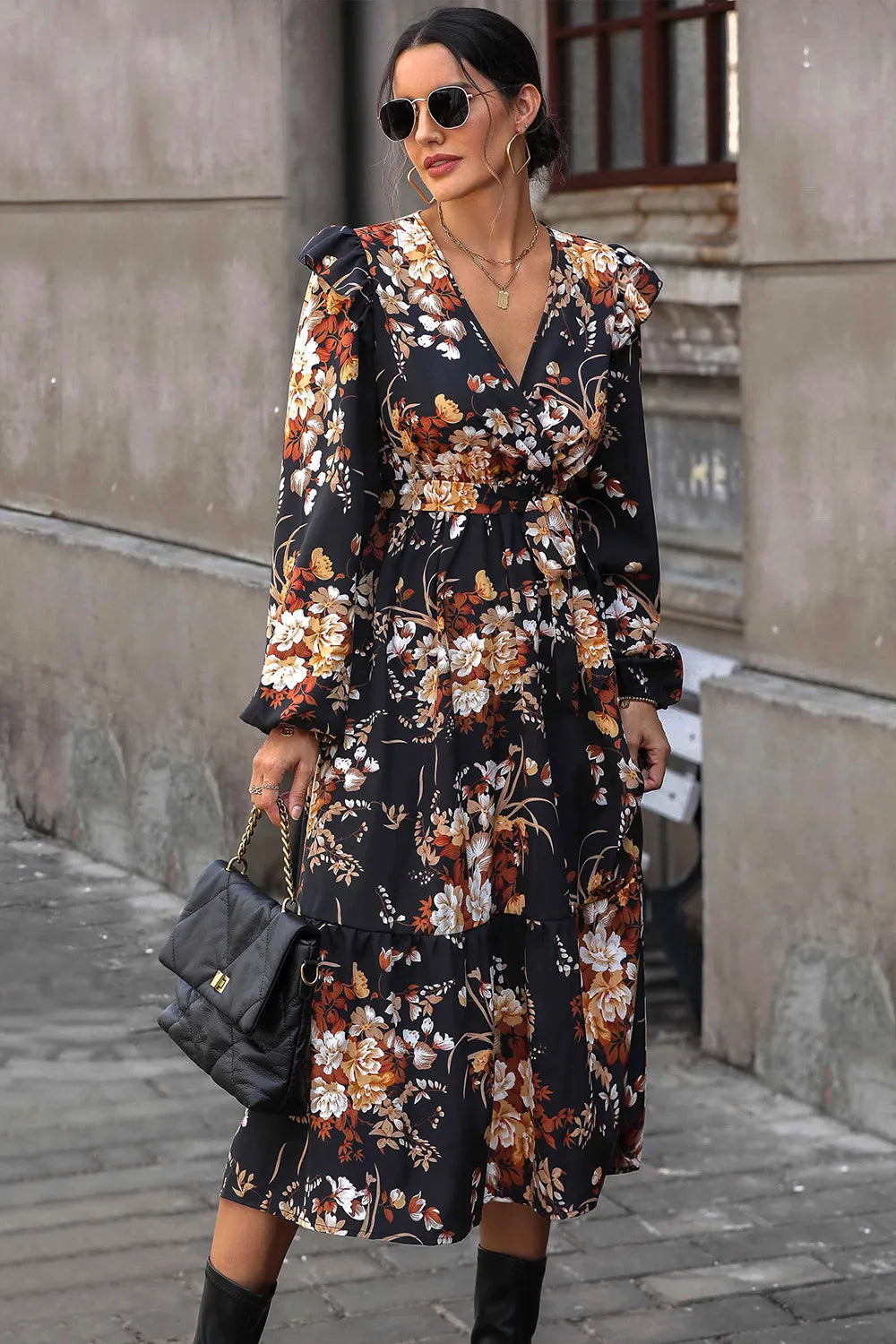Velste Perfee Floral Surplice Tie Front Ruffle Hem Midi Dress