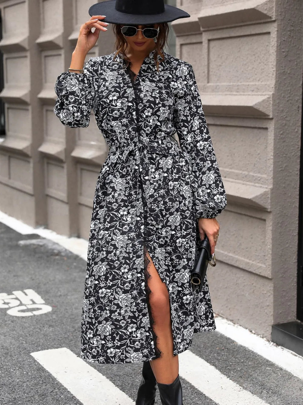 Velste Perfee Lace Detail Printed Long Sleeve Midi Dress