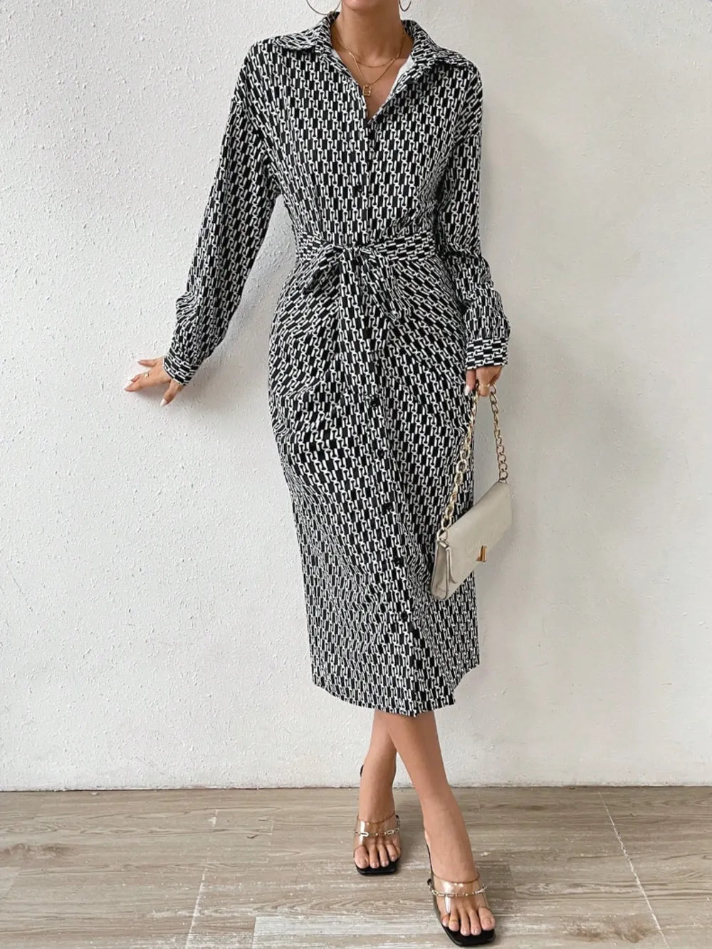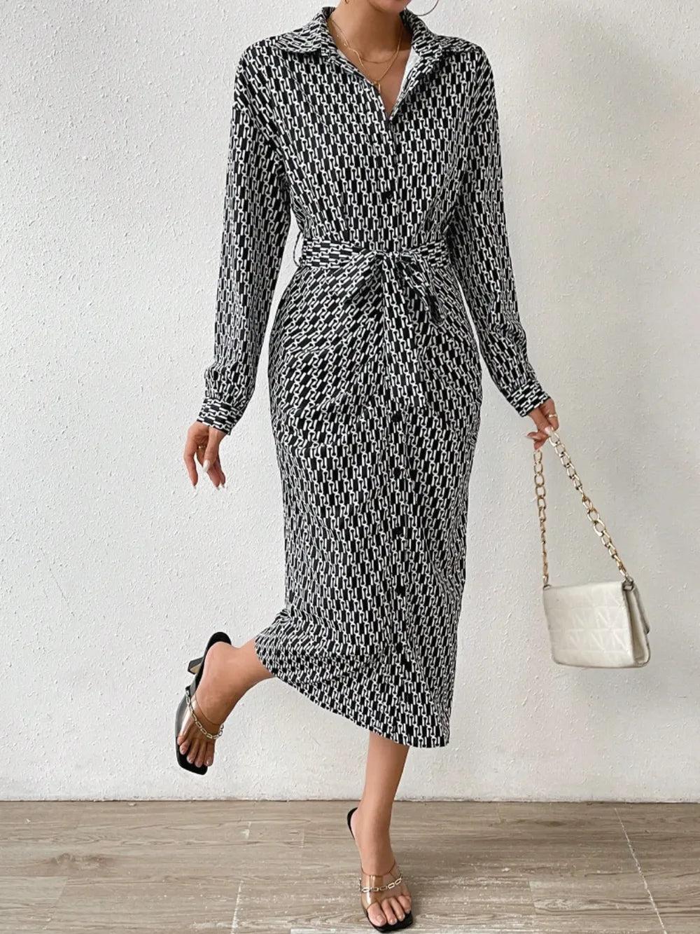 Printed Tie Waist Long Sleeve Midi Shirt Dress