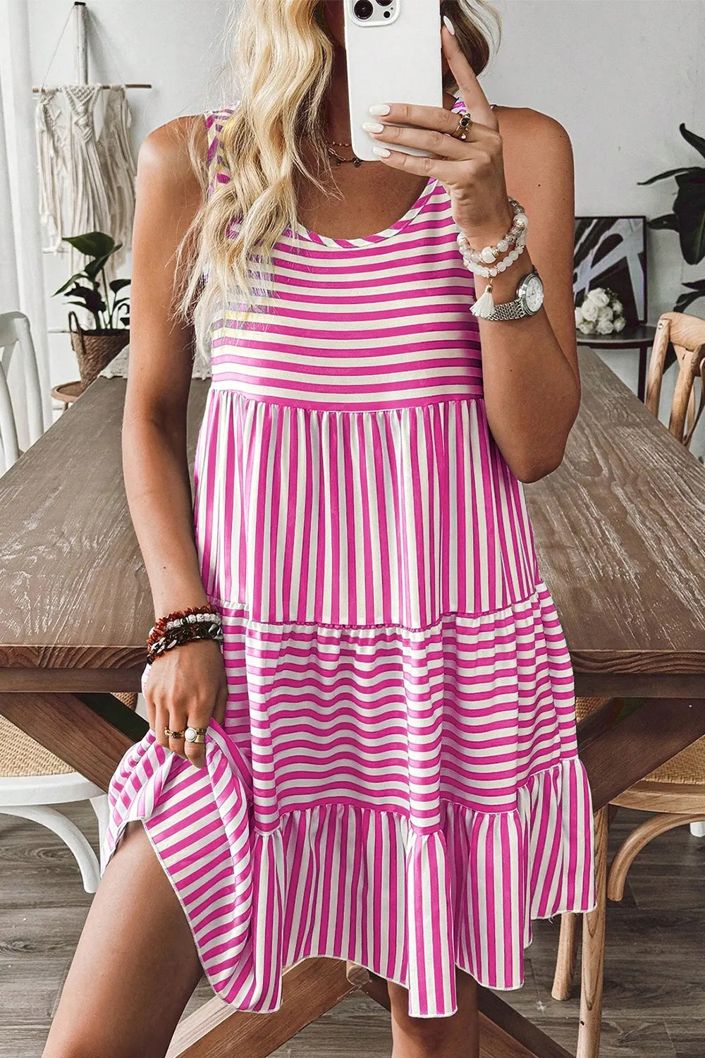 Velste Stripe U Neck Sleeveless Loose Fit Mini Dress