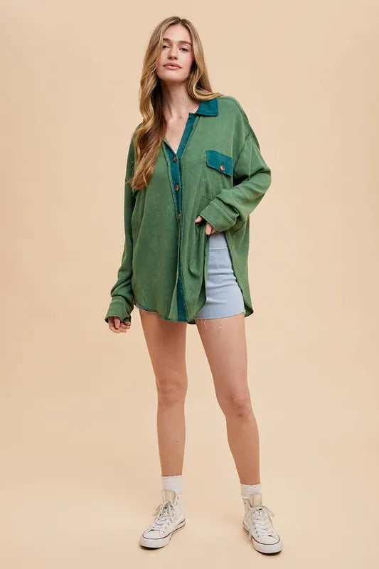 The Waffle-Knit Mineral Washed Button Down Shirt is a stylish and unique piece. The waffle-knit texture adds a cozy and tactile element to the shirt. The mineral washed finish gives it a trendy and slightly distressed look. With button-down detailing, this shirt offers a classic and versatile style. This shirt is perfect for adding a touch of texture and character to your outfit, whether worn casually with jeans or layered over a tee for a relaxed yet fashionable look.