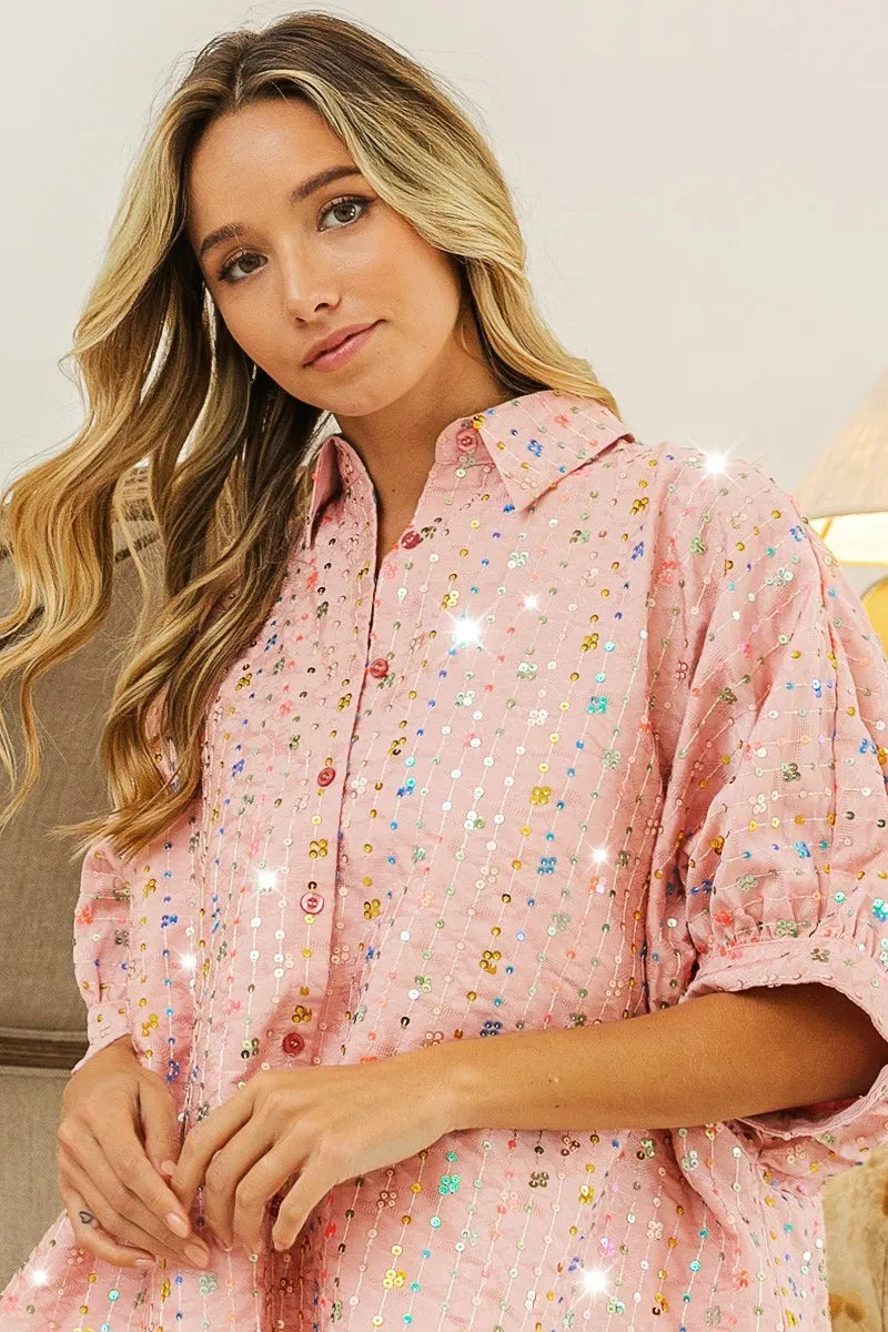 BiBi Sequin Striped Short Dolman Sleeve Blouse