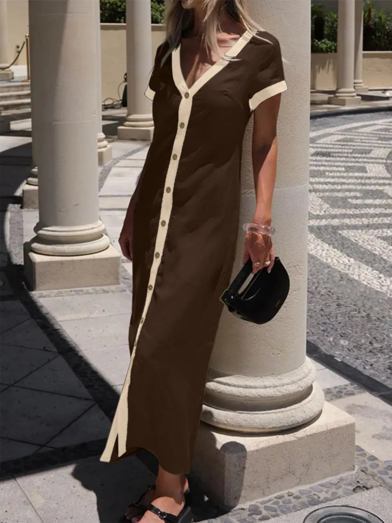 Button-Front Contrast Trim Midi Dress