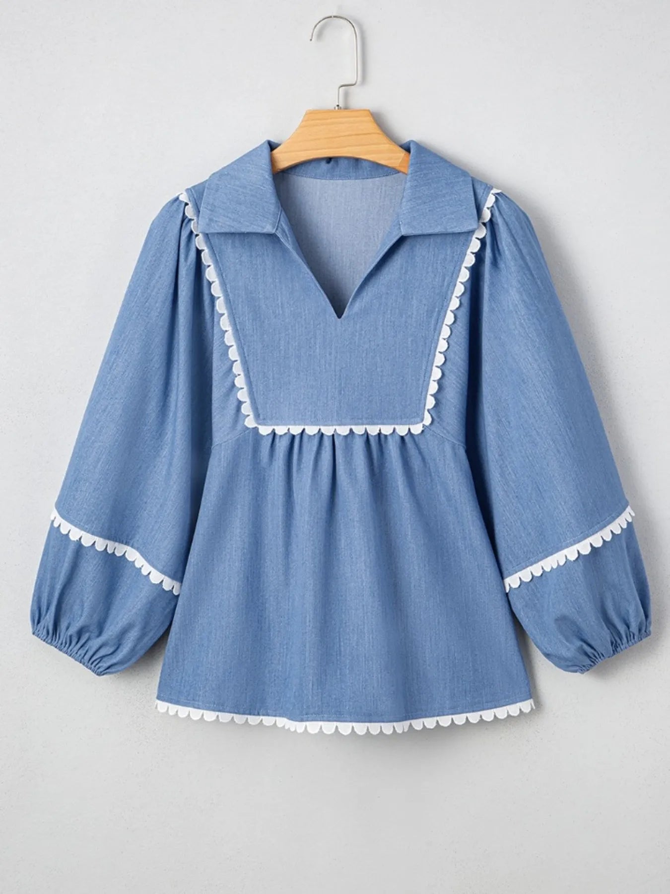 Collared Neck Contrast Trim Balloon Sleeve Blouse