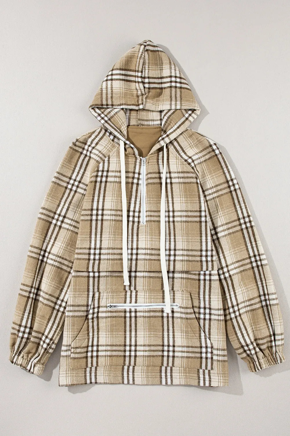 Drawstring Plaid Half Zip Raglan Sleeve Hoodie