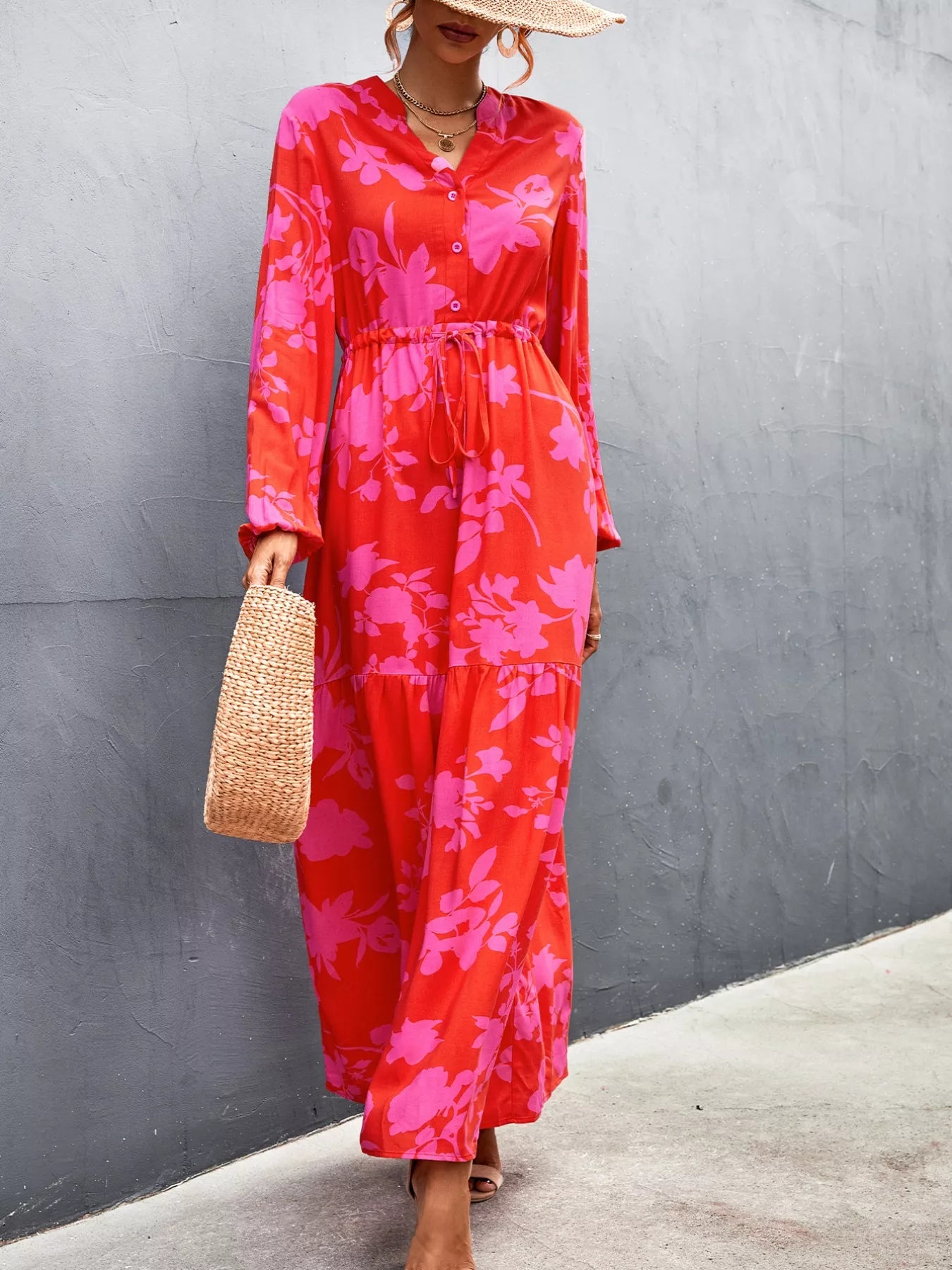 Velste Floral Drawstring Waist Long Sleeve Maxi Dress
