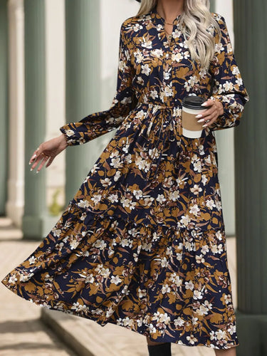 Perfee Printed Notched Long Sleeve Midi Dress