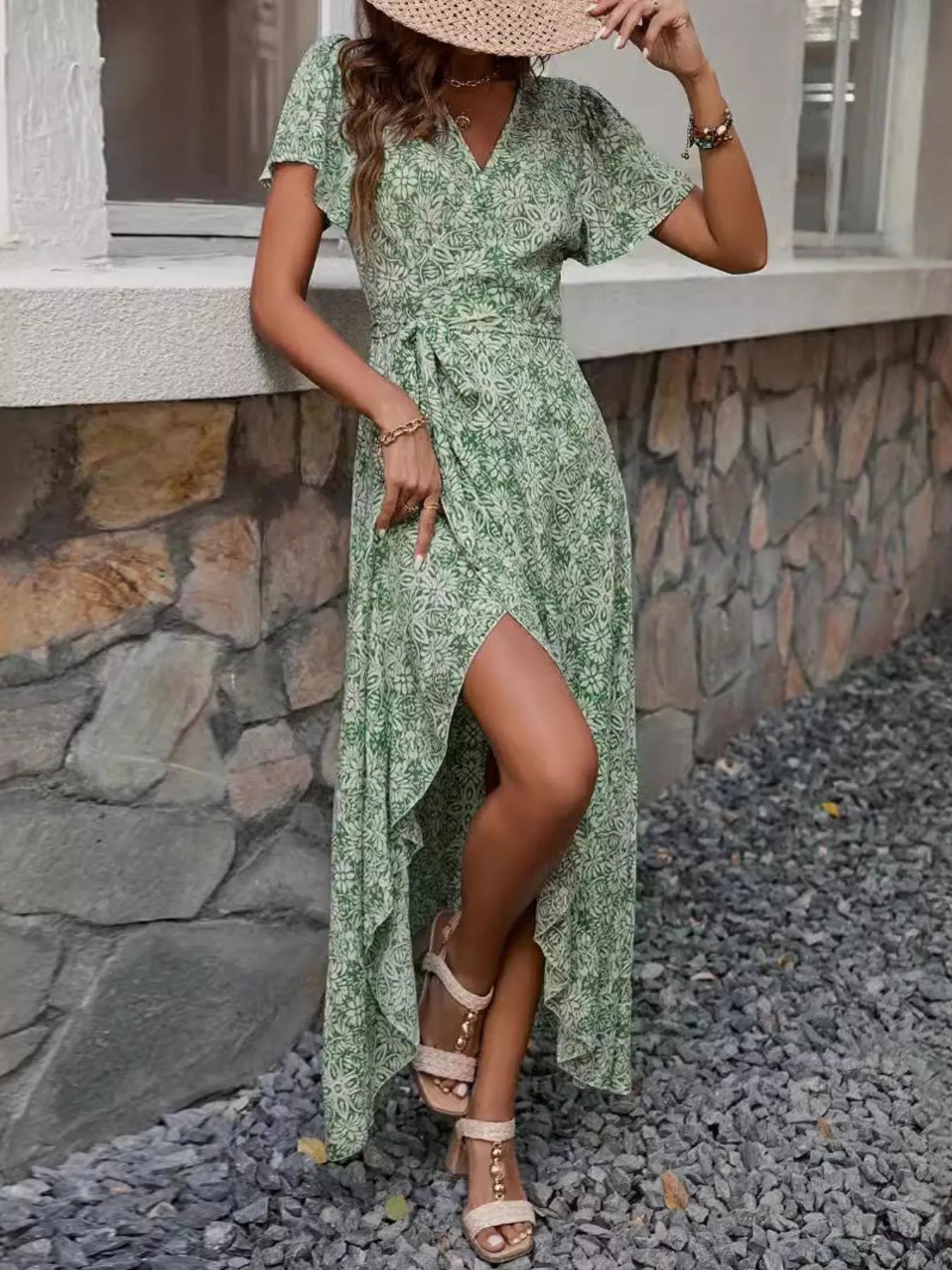 Printed Surplice Maxi Dress with Flutter Sleeves