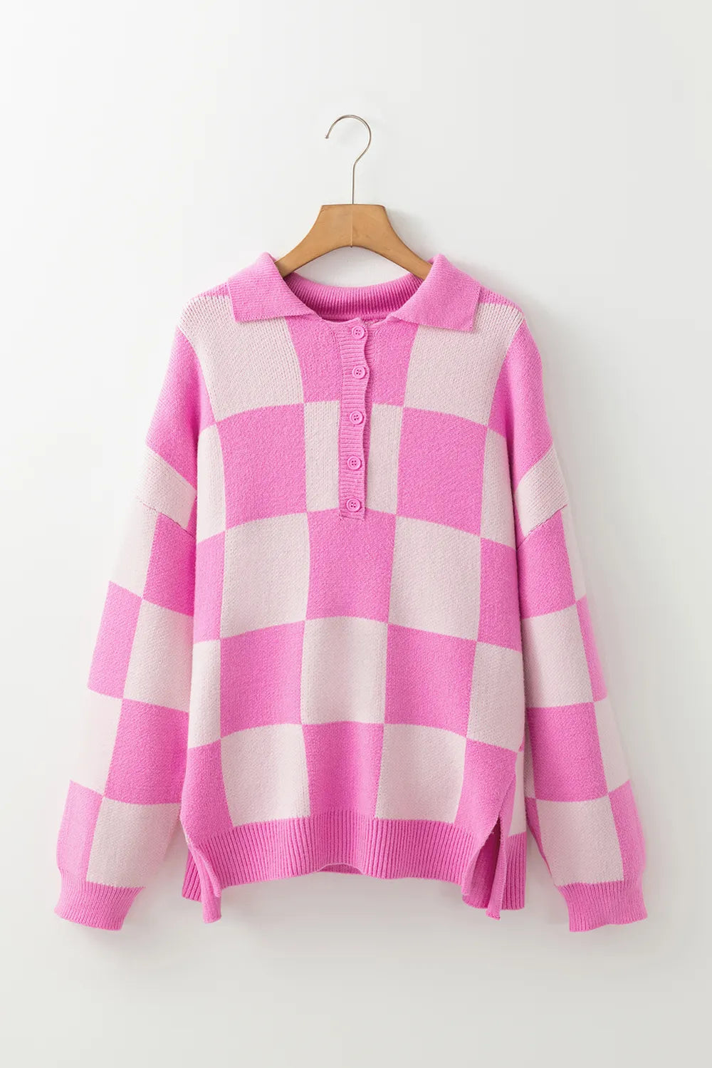 Slit Checkered Half Button Long Sleeve Sweater
