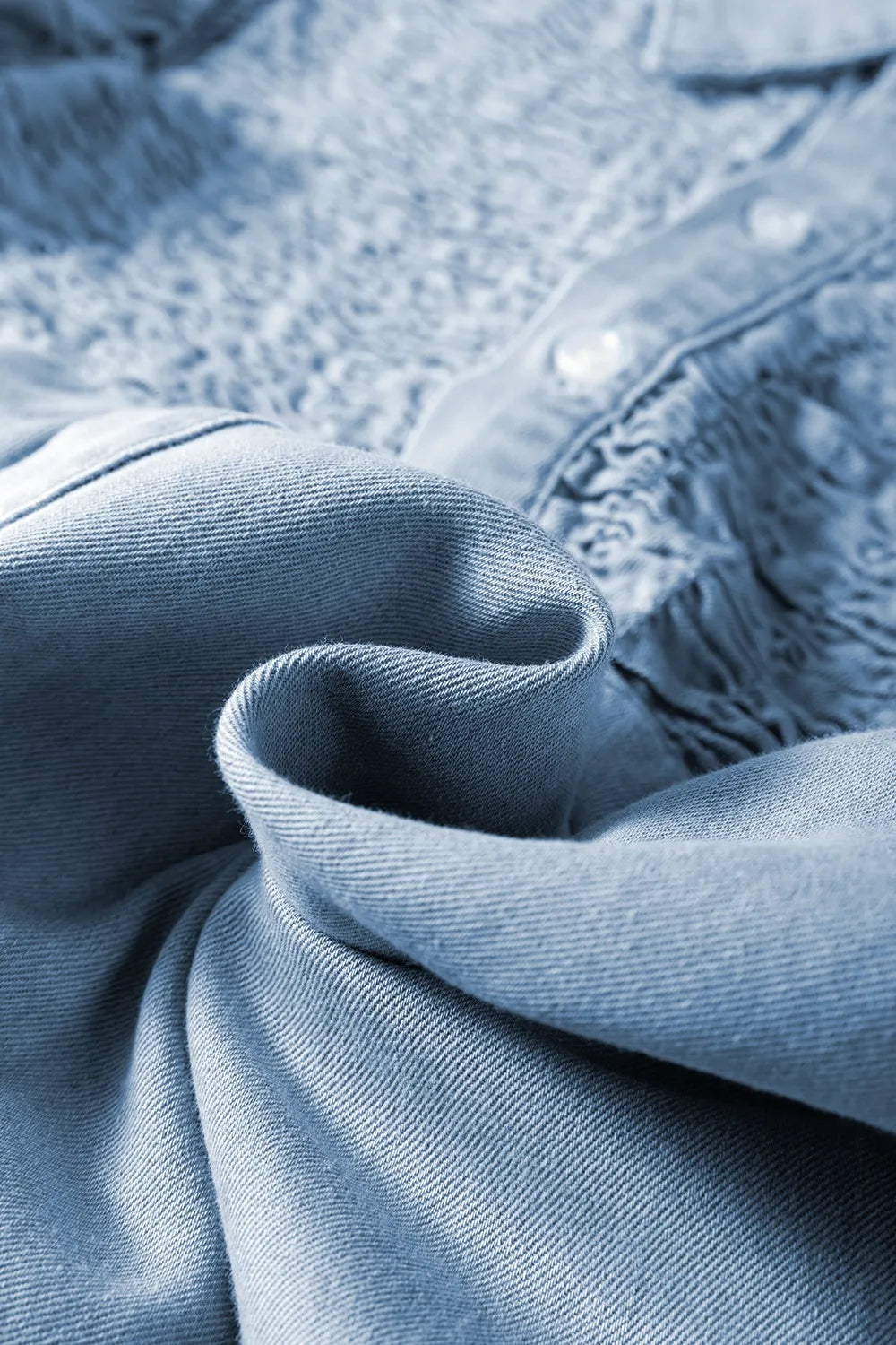 Smocked Collared Neck Cap Sleeve Denim Dress