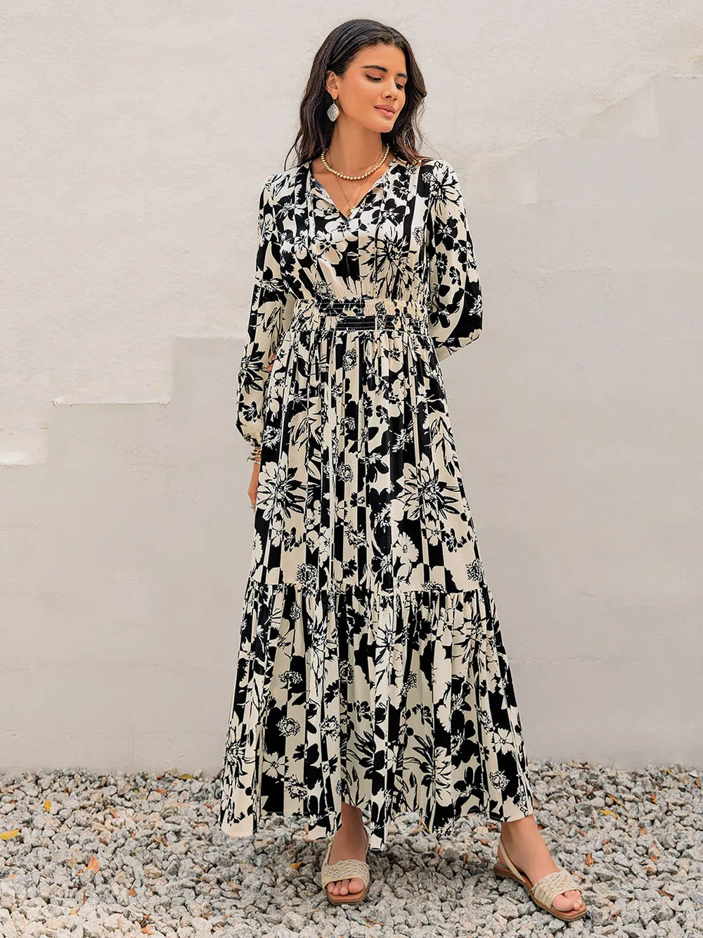 Velste Smocked Printed Tie Neck Long Sleeve Dress