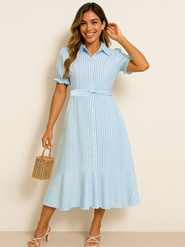 Velste Striped Button-Down Midi Shirt Dress with Ruffle Sleeves