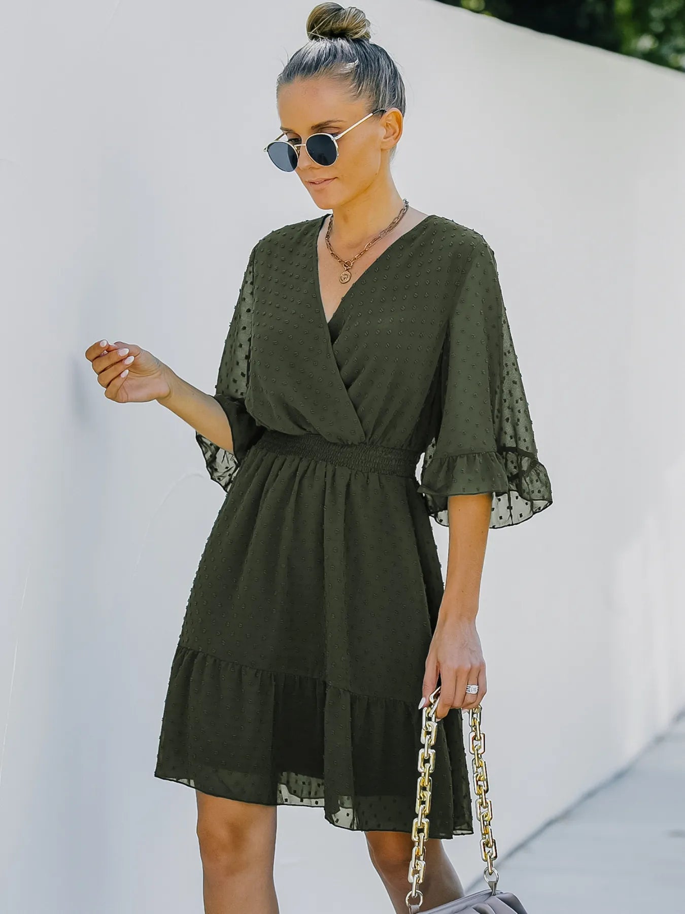 Swiss Dot Flare Sleeve Wrap Mini Dress