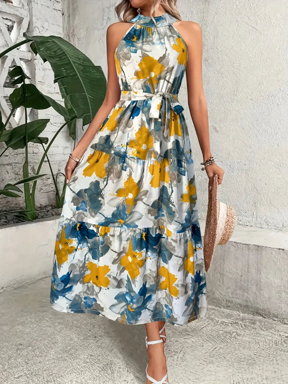 Velste Tiered Printed Mock Neck Sleeveless Dress