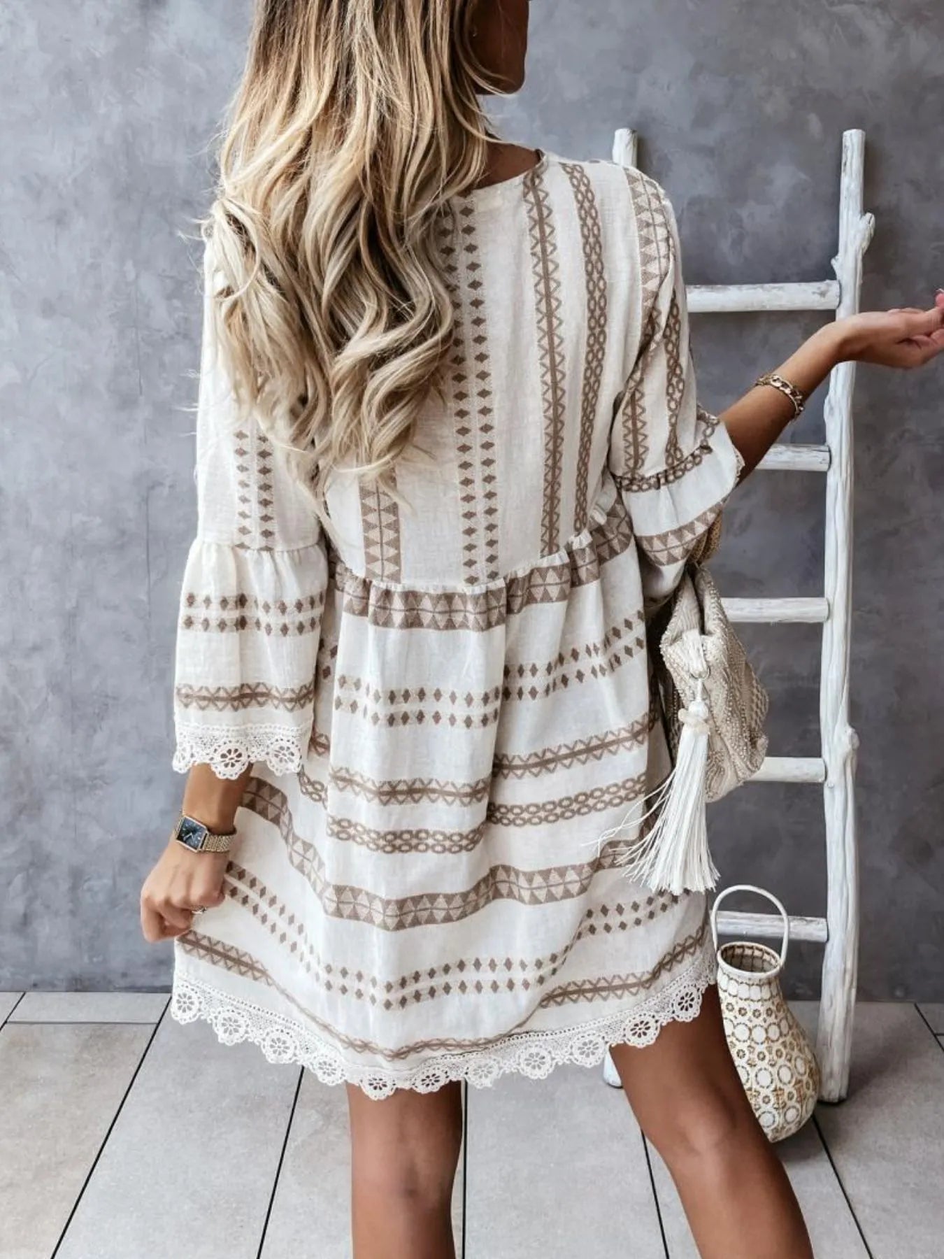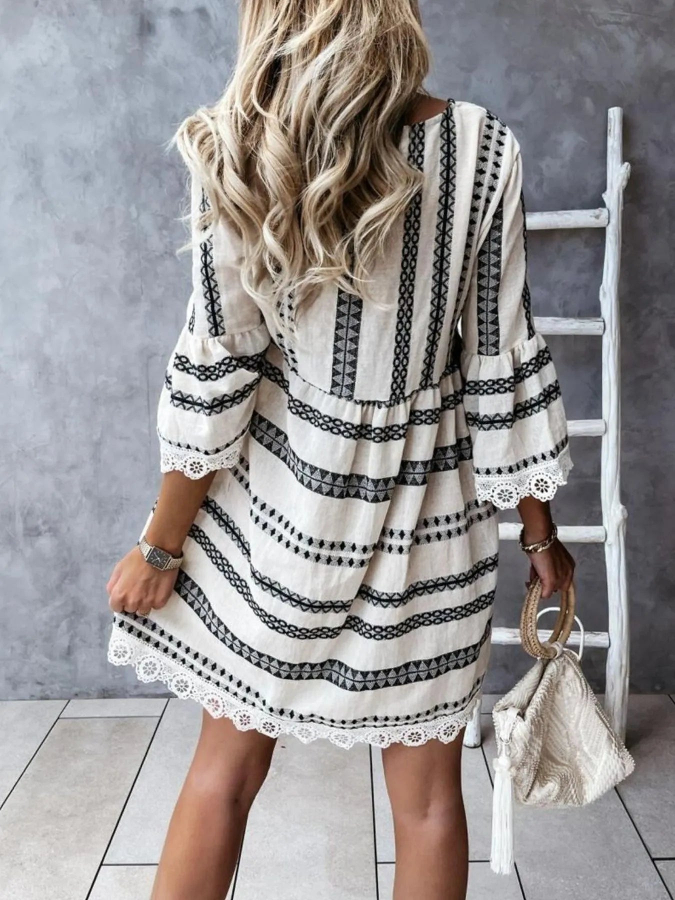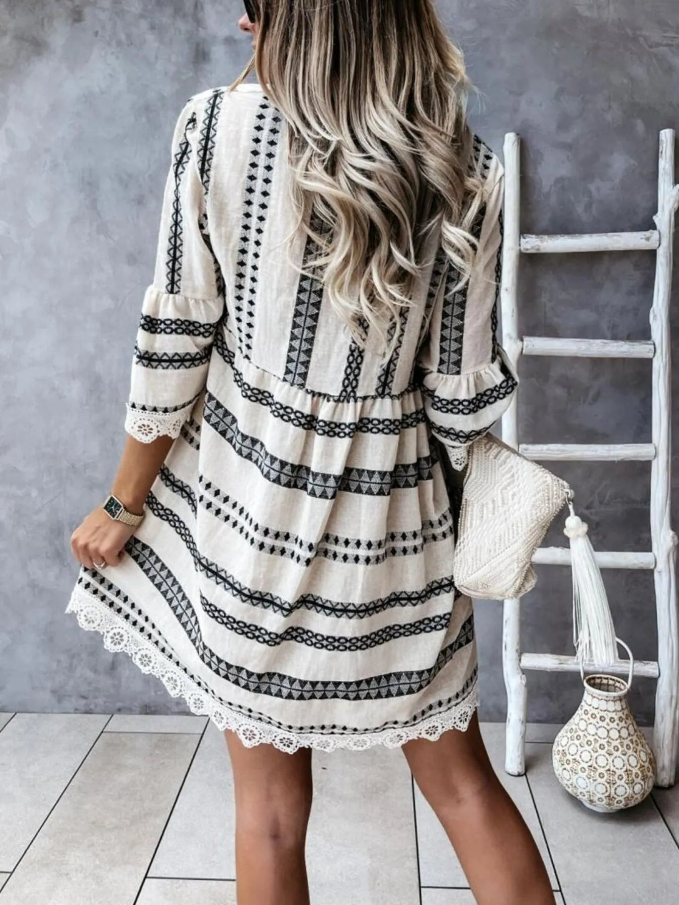 Velste V-Neck Lace Trim Striped Babydoll Dress