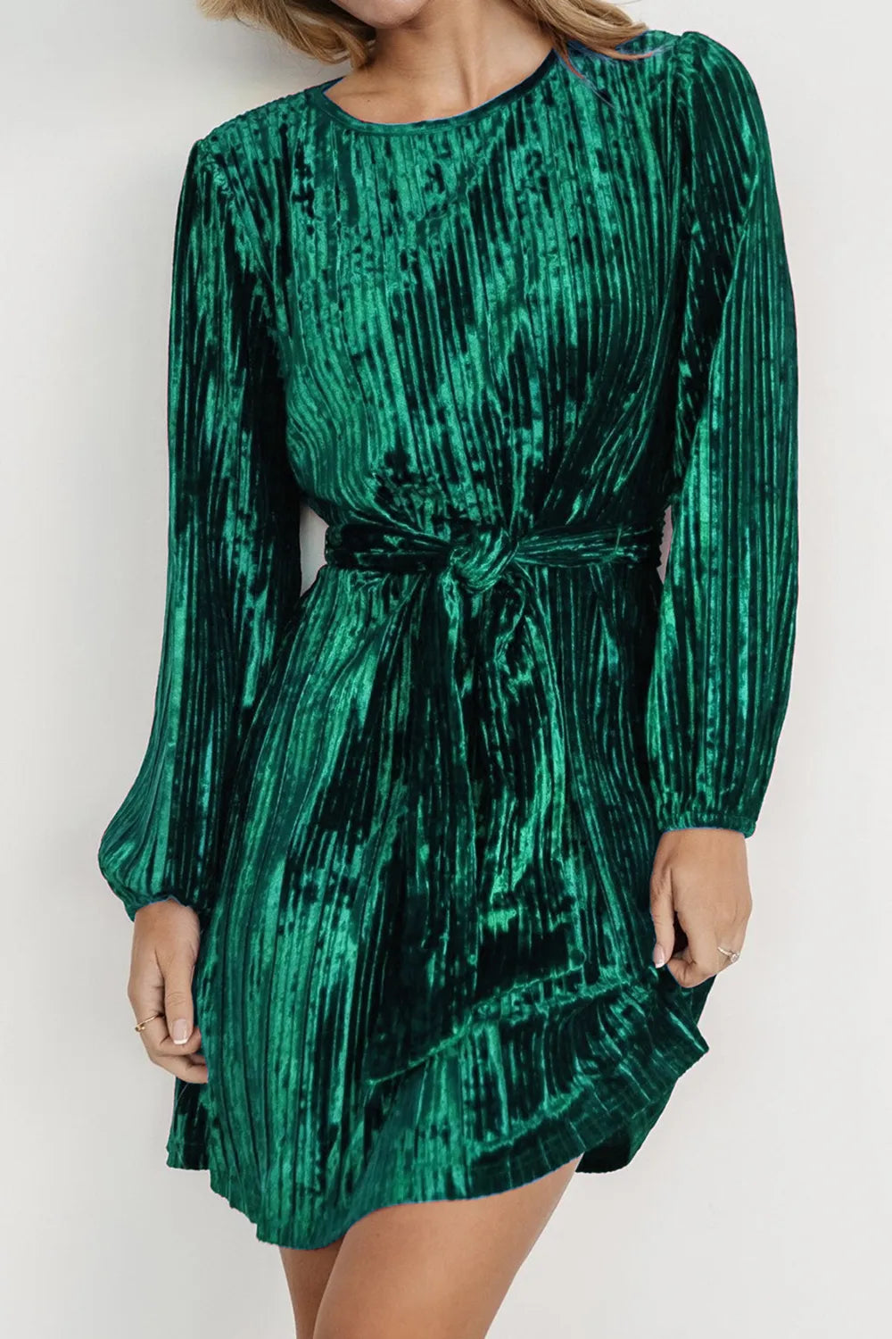 Velvet Round Neck Tie Waist Long Sleeve Mini Dress